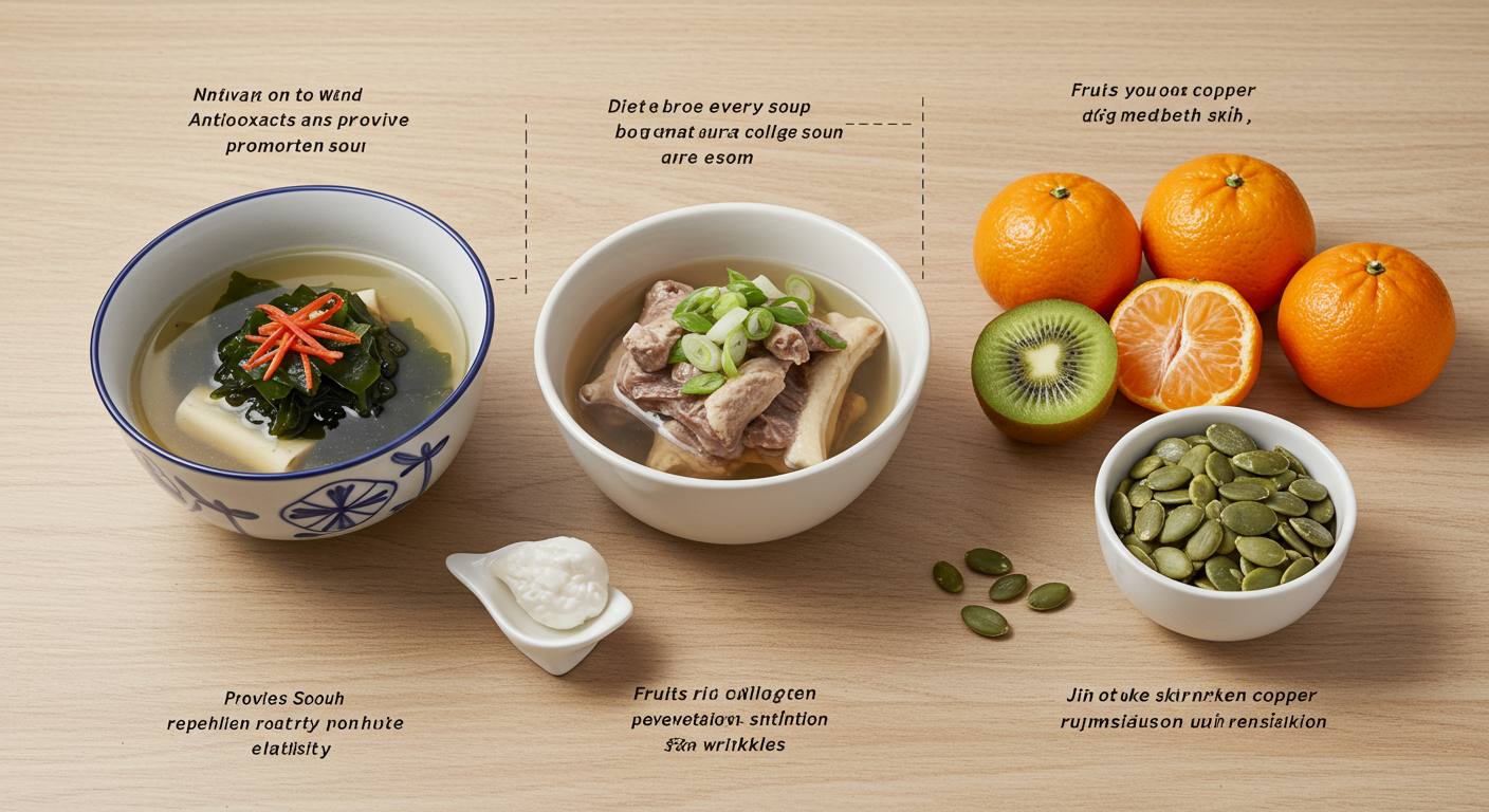 피부 관리에서 가장 중요한 것은 식습관입니다. 매일 먹는 음식이 피부의 건강을 좌우합니다. 첫째, 멸치와 미역국은 아미노산과 항산화 성분을 제공해 탄력 있는 피부를 만듭니다. 둘째, 사골국물이나 도가니탕은 천연 콜라겐을 공급하여 나이로 줄어드는 콜라겐을 보충합니다. 셋째, 비타민 C가 풍부한 귤, 키위 같은 과일은 콜라겐 합성에 도움을 줍니다. 넷째, 호박씨 같은 견과류는 아연과 구리가 풍부해 색소 침착을 막고 피부 재생을 촉진합니다. 이 간단한 네 가지 원칙만 지켜도 피부 톤이 밝아지고 잔주름이 줄어드는 변화를 경험할 수 있습니다.