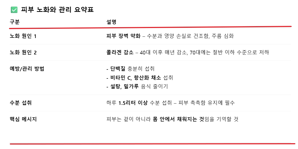 ✔ 오늘 내용 요약: 음식으로 콜라겐 보충 → 피부 장벽 강화 → 천연팩 활용 → 피부 나이 되돌리기