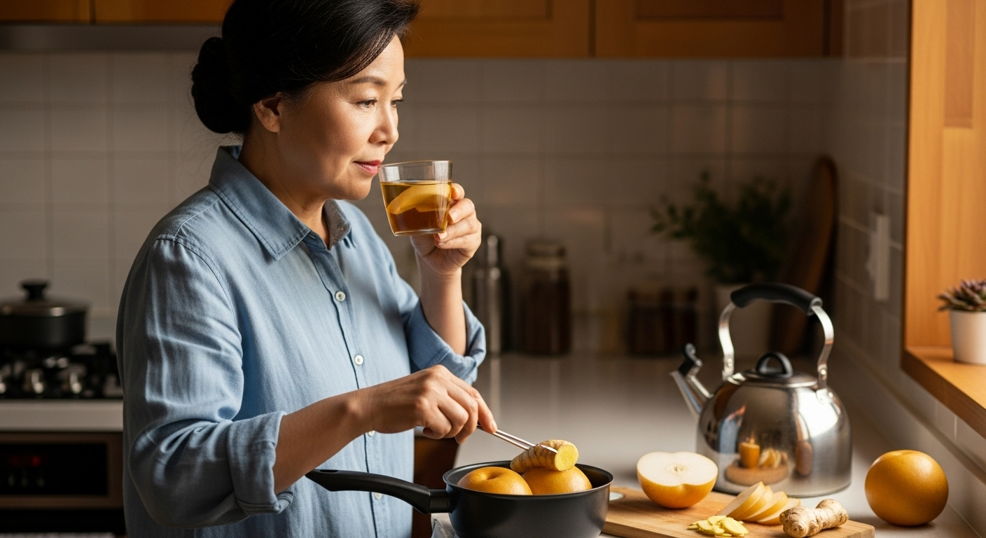 배 반 개 + 생강 한 조각을 약불에서 10분 끓여 따뜻하게 마시세요. 손발이 찬 분에게는 순환을 돕고, 야간뇨 완화에도 탁월한 효과가 있습니다.