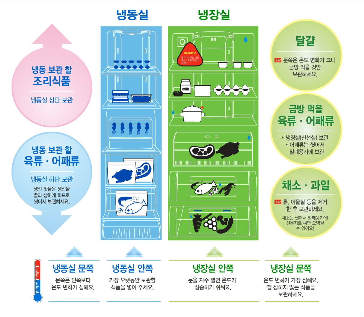 - 하단 : 육류·생선류 (밀폐 용기 보관 필수)