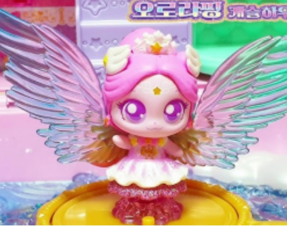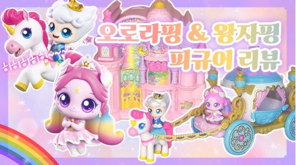 매력: 오로라핑의 가장 큰 매력은 환상적인 색상의 캐릭터와 파스텔톤의 색감, 반짝이는 글리터로 장식된 동화 같은 성을 배경으로 하고 있습니다. 아래 그림에서 보듯이 큰 날개와 화려한 의상은 아이들에게 상상력을 자극하며 다양한 이야기를 만들어낼 수 있는 기회를 제공합니다.
