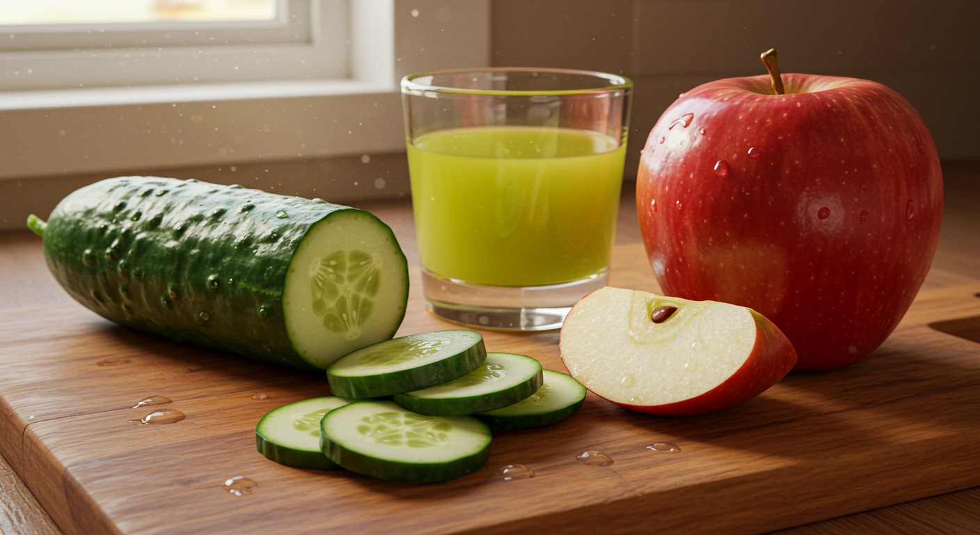 1) 오이 + 사과 — 사과의 팩틴과 오이의 비타민 K가 만나 혈관을 튼튼히 하고 콜레스테롤 수치를 낮춥니다. 속이 약한 분도 편안하게 먹을 수 있습니다.
