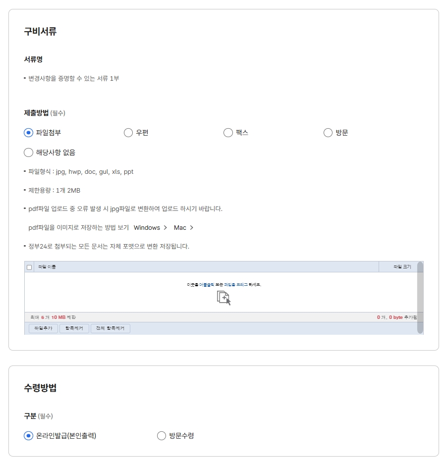 * 민원신청 시 수령방법 온라인 발급(본인출력)으로 신청해야 편리합니다.