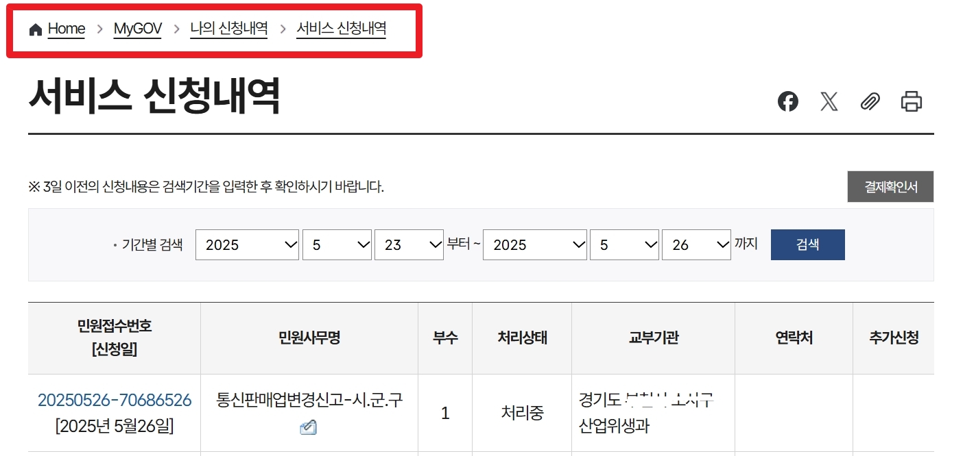 [My GOV → 나의 신청내역 → 민원 처리완료 내역] 확인