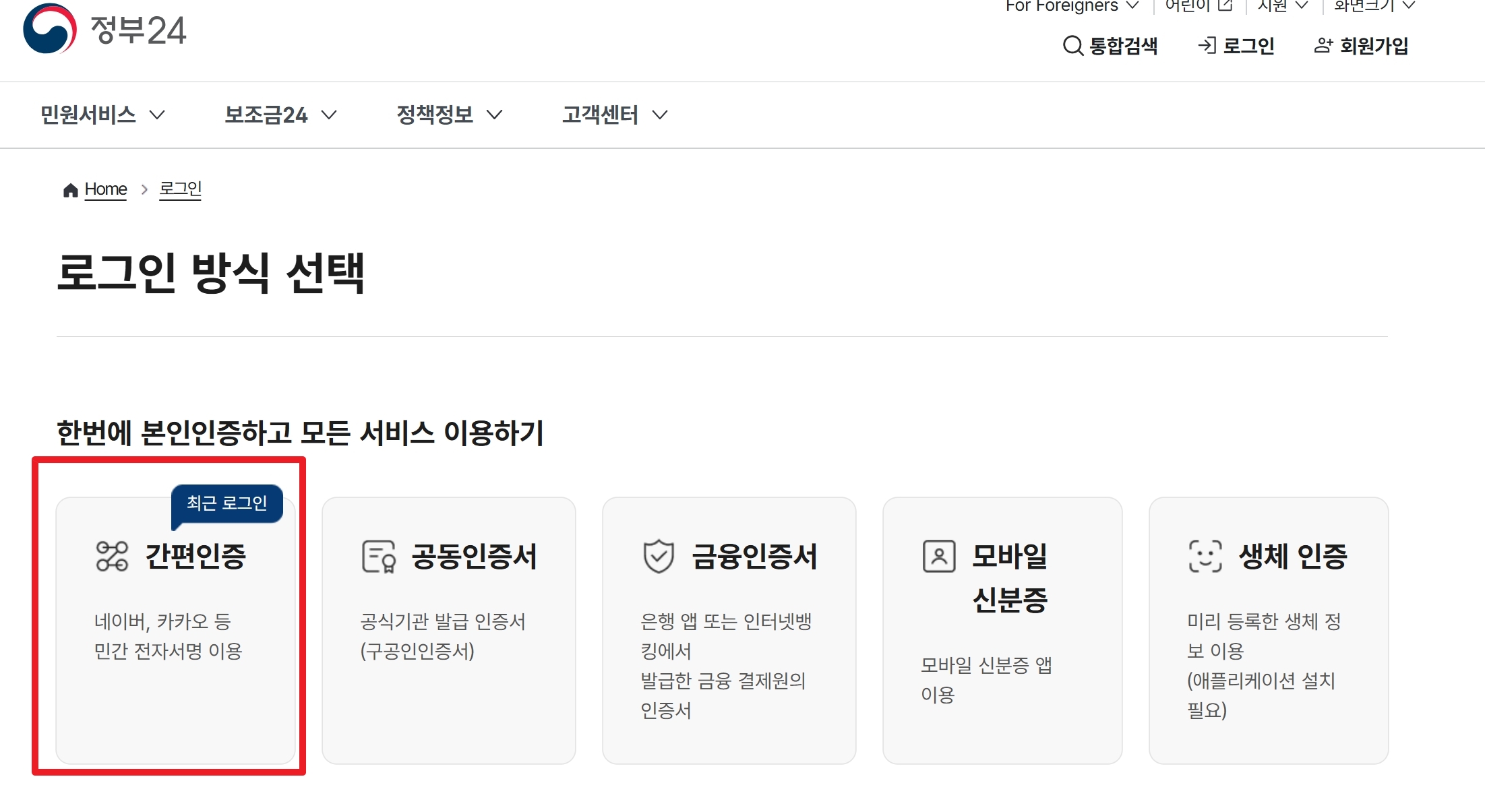 - 공동인증서(구 공인인증서) 또는 간편 인증서(카카오, PASS 등)로 로그인