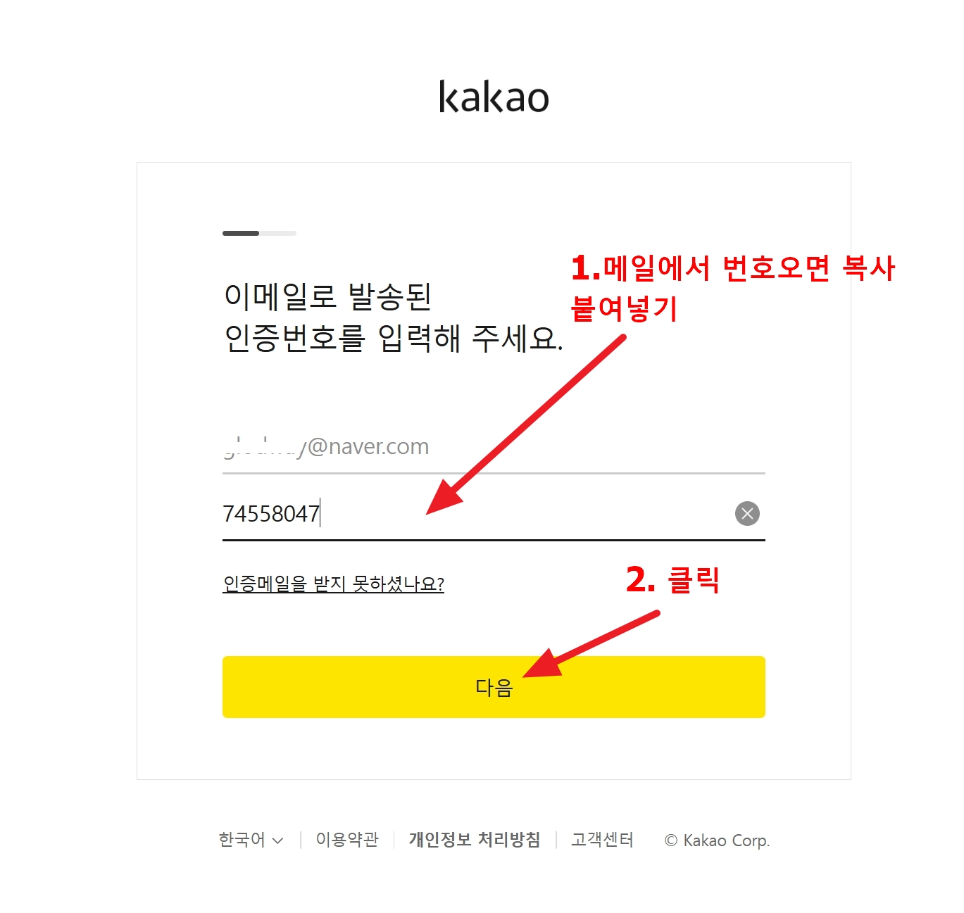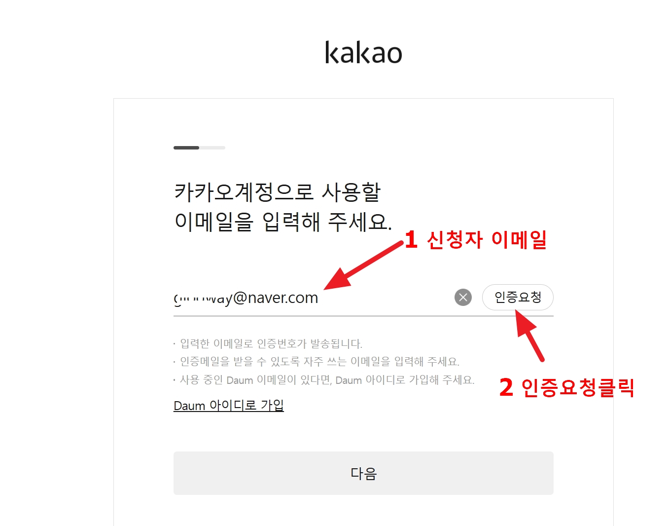 입력한 이메일로 인증 메일이 발송됩니다. 메일함에서 인증 메일을 확인하고, 인증번호를 입력하여 인증을 완료합니다. 그리고 다음을 클릭합니다.