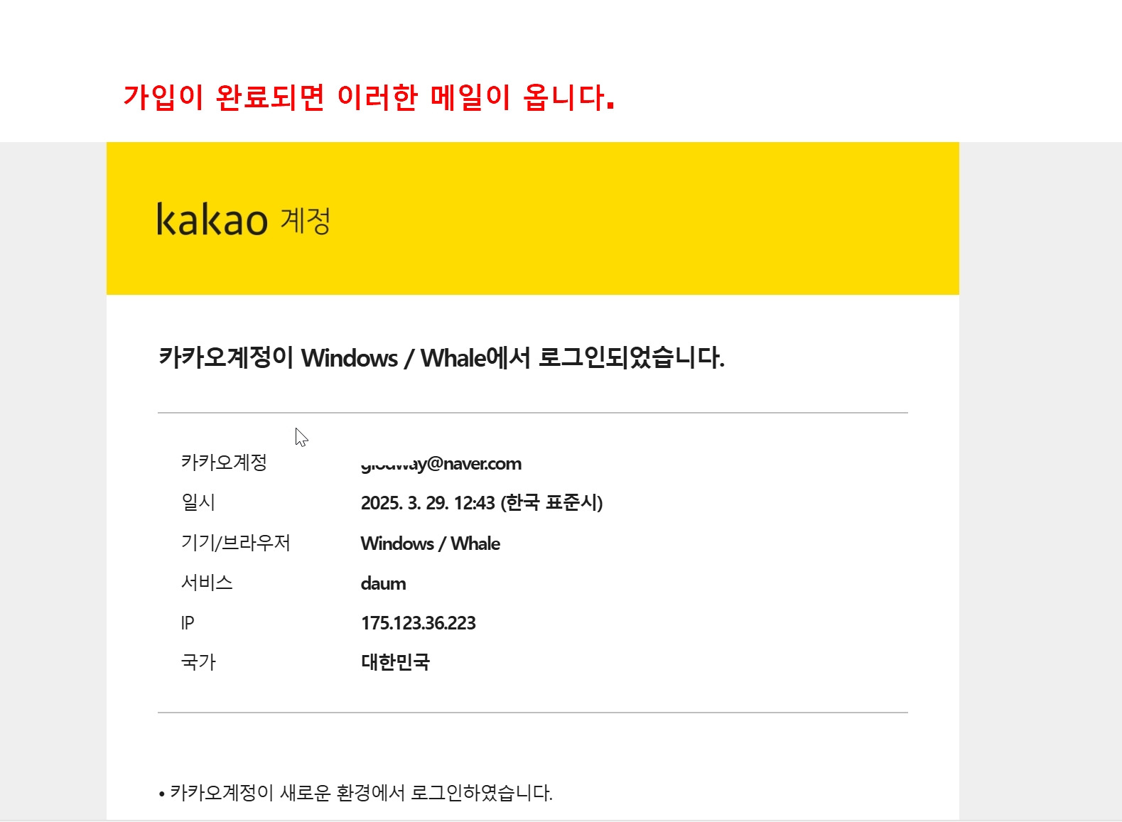 1) 가입이 완료되면, 이메일로 발송된 인증 메일을 다시 확인하세요. 인증 메일에는 가입 완료 및 계정 활성화 관련 정보가 담겨 있습니다. 이 메일을 통해 계정의 활성화 여부를 확인할 수 있습니다.