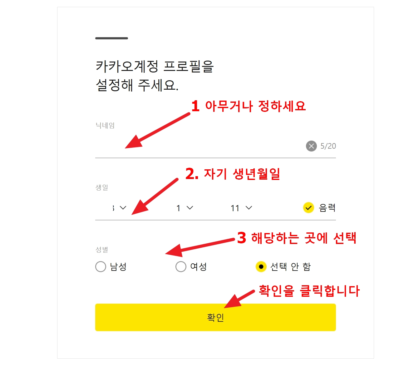 남성, 여성 성별을 입력 후에 확인을 클릭합니다