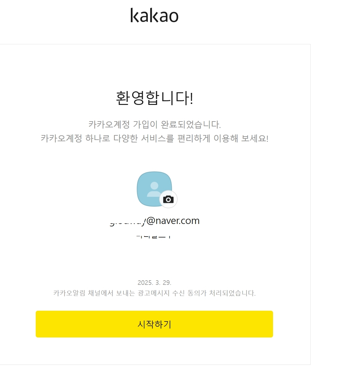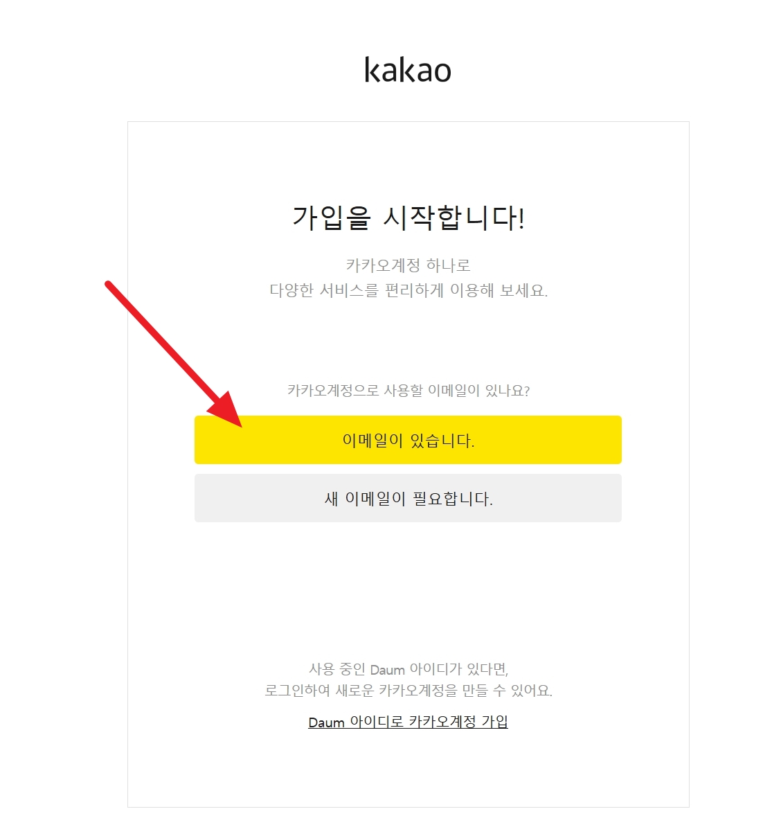 3) 새로운 카카오 계정 만들기 : 새로운 카카오 계정 만들기를 클릭합니다.'이메일을 이용해 카카오 가입' 옵션을 선택합니다. 아래의 화면에서 가입을 시작할 수 있습니다.