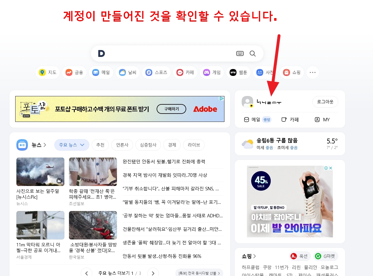 다음 홈페이지에서 카카오계정으로 로그인클릭
