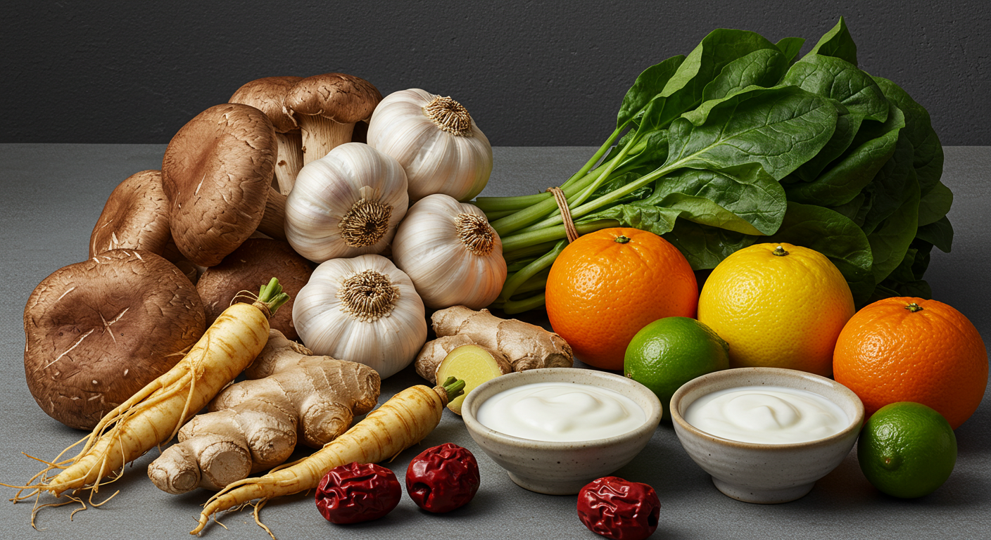 마늘에는 알리신(Allicin) 성분이 풍부하여 세균과 바이러스 증식을 억제합니다. 하루 1~2쪽만 꾸준히 섭취해도 감기 예방과 피로 회복에 도움이 됩니다. 생으로 먹거나 다진 마늘을 요리에 활용하면 효과적입니다.