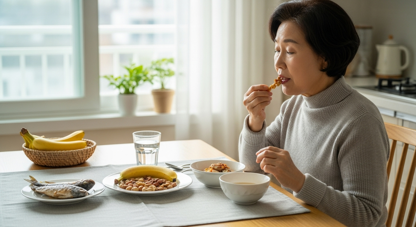 햇살이 드는 아늑한 주방 테이블, 60~70대 한국 여성이 아침 식사로 바나나 하나와 견과류 한 줌을 접시에 담아 먹고 있다. 옆에는 물 한 컵도 함께 놓여 있다. 점심 시간에는 등푸른 생선이 메인 반찬으로 올라온 깔끔한 한식 밥상이 준비되어 있으며, 건강을 위한 식단이라는 느낌이 강하게 전해진다. 여성은 정갈한 일상복 차림이며, 표정은 차분하고 만족스럽다. 장면은 ‘건강한 루틴의 실제’라는 분위기를 담고 있다.