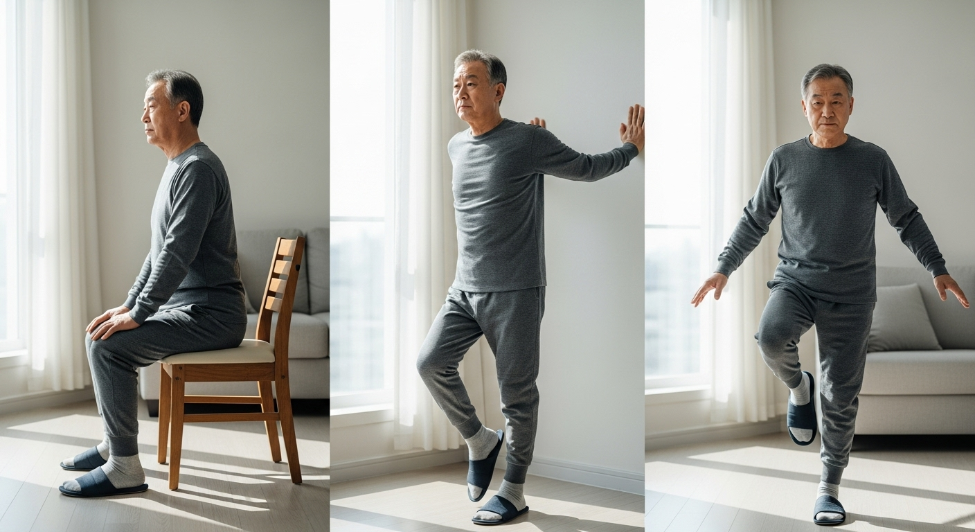이 세 가지 동작은 장비 없이 집에서도 쉽게 할 수 있습니다. 하루 10분이면 넘어지지 않는 중심을 만들 수 있습니다.