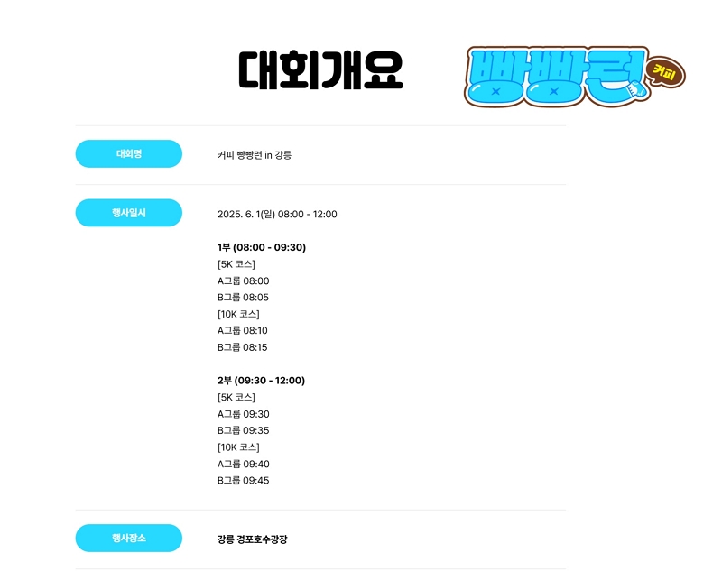 2025년 커피 빵빵런은 ** 2025. 6. 1(일) 08:00 - 12:00 **에 강릉에서 개최됩니다. 대회 장소는 강릉의 아름다운 해변 근처로, 참가자들은 멋진 경치를 감상하며 달릴 수 있습니다. 대회는 10K 코스와 5K 코스로 나뉘어 진행되며, 모든 연령대의 참가자들이 즐길 수 있도록 구성되어 있습니다.