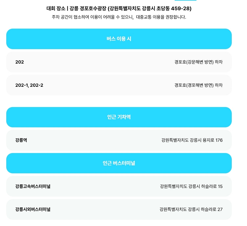 대회 당일에는 많은 인원이 모일 것으로 예상되므로, 주차 공간이 제한적입니다. 대중교통을 이용하시는 것을 추천드립니다. 강릉역에서 대회 장소까지는 버스와 택시를 이용할 수 있으며, 대회 전용 셔틀버스도 운영될 예정입니다. 대중교통을 이용하면 편리하게 대회에 참여할 수 있습니다.
