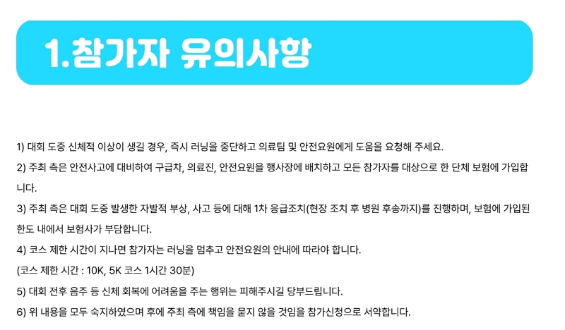 A: 기본적인 운동화와 편안한 복장만 있으면 됩니다. 대회 전에 충분한 준비 운동을 해주세요.