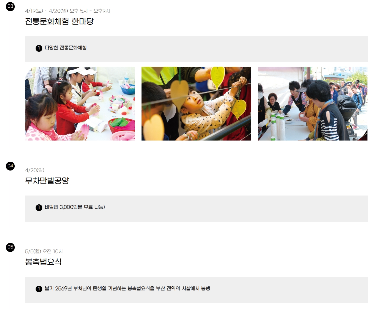 • 주요 프로그램 : 전통문화 공연, 연등 퍼레이드, 불교 체험 부스 등