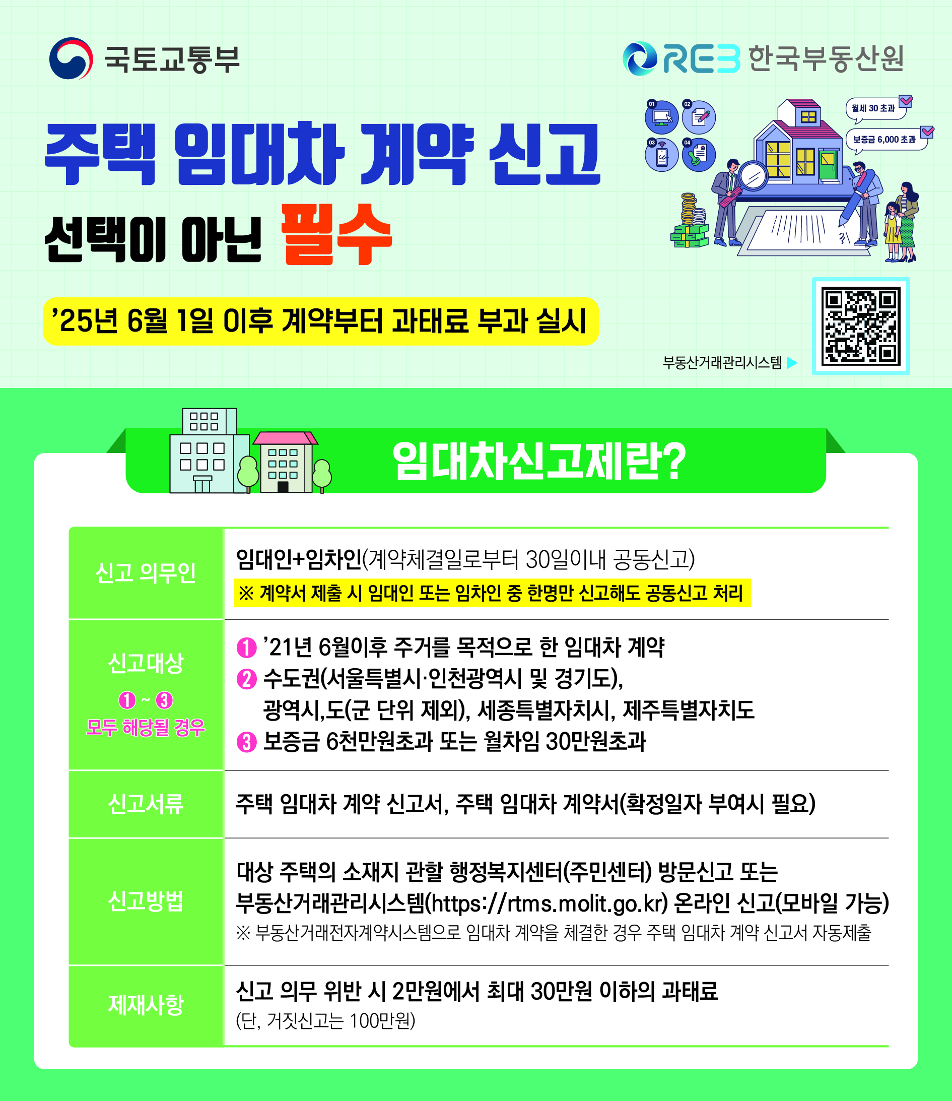 보증금 6천만 원 또는 월세 30만 원을 초과하는 계약은 반드시 신고해야 하며, 이를 통해 전·월세 시세를 투명하게 관리하고 임차인의 권리를 보호하려는 목적이 있습니다.