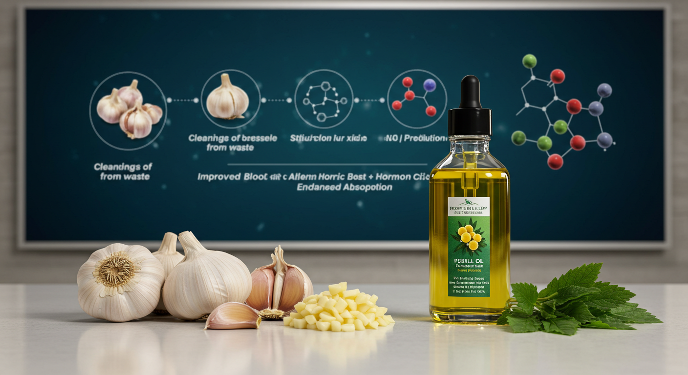 마늘은 혈관 속 노폐물을 정화하고 산화질소 생성을 촉진하는 강력한 천연 성분 알리신을 함유합니다. 하지만 알리신은 불안정하여 쉽게 파괴되므로, 이를 보호하고 흡수를 높여주는 역할을 하는 것이 바로 들기름입니다. 들기름은 오메가-3·6 지방산과 아연, 셀레늄을 함유해 호르몬 생성과 혈관 안정화에 도움을 줍니다. 따라서 두 재료가 만나면 혈류 개선 + 호르몬 촉진 + 흡수 강화라는 3중 효과를 기대할 수 있습니다.