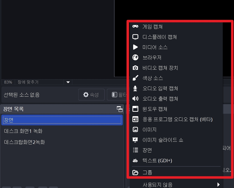 -방송 타입에 맞게 선택목록에서 선택합니다. 참고로 디스플레이 캡처는 화면 방송녹화 시 활용할 수 있습니다.